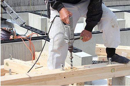 コンクリート打設とは、型枠の中に生コンクリートを流し込んでいく作業のこと。型枠の隅々にまで生コンクリートが均等に行き渡るよう、注意深く作業します。コンクリート打設が終わったら、コンクリートが固まって十分な強度が確認できたところで型枠を解体します。